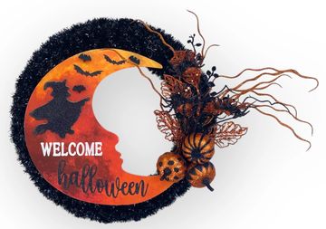 Black Tinsel wraps this 14" round wire frame. Wooden half-moon shaped Sign glittered with a Witch, Bats and "Welcome Halloween". Finished with Glittered Halloween florals. (Total finished diameter - 14".)