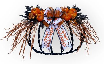 Wire 3D Pumpkin frame wrapped in Silken Black Macramé cord. Adorned with Glittered and Velvet Halloween florals and finished with a Glittered coordinated Bow. (Total finished size - 16" x 20".)