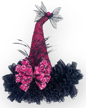 Witch's hat-wreath in this Halloween's hottest color! Wrapped in Black Glittered Mesh Ribbon over Hot Pink Satin Ribbon. Base of Hat finished in Black Deco Mesh. Adorned with Black Glittered Spray and coordinating Bow. (Total finished size - 17" x 20".)