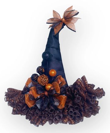 Witch's hat-wreath wrapped in Black Ribbon. Base of Hat finished in Black and Orange Deco Mesh. Adorned with Black and Orange Glittered Balls and coordinating Bow. (Total finished size - 17" x 20".)