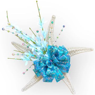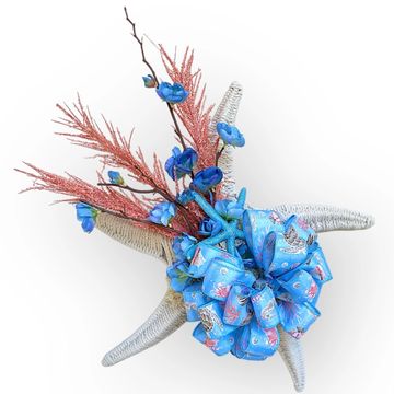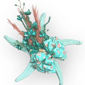 Starfish-shaped wire form wrapped in Natural Silk Cording, and adorned with Sea-inspired Satin Ribbon with coordinating Florals and Rainbow Pearls. (Total finished size - 16" x 16".)