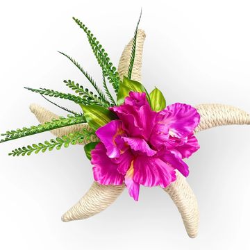 Starfish-shaped wire form wrapped in Natural Cotton Rope, and adorned with Fuchsia Hibiscus with Rainbow Pearl Centers and Sea-inspired Greenery. (Total finished size - 16" x 16".)