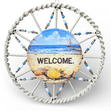 Bicycle Wheel metal frame wrapped in Ecru Silken Macrame cord. Embellished with glass and clay Beach-themed beads. Finished with a metal "Welcome" Beach-themed sign. (Total finished diameter - 14".)