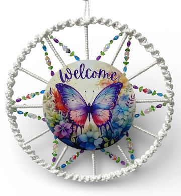 Bicycle Wheel metal frame wrapped in White Silken Macrame Cord. Embellished with glass "Flower"-themed beads. Finished with a metal "Welcome" signed adorned with a Butterfly and florals. (Total finished diameter - 14".)